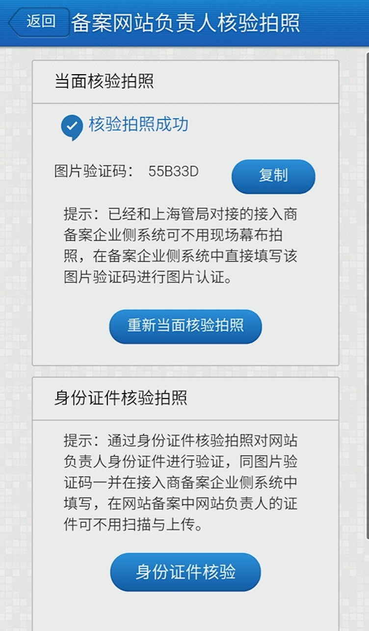 重新驗證:如果您的核驗拍照環境光線不清楚時,可以選擇重新驗證。點擊會重新進入備案網站手機當面核驗拍照,驗證成功將替換上次手機核驗拍照圖片。